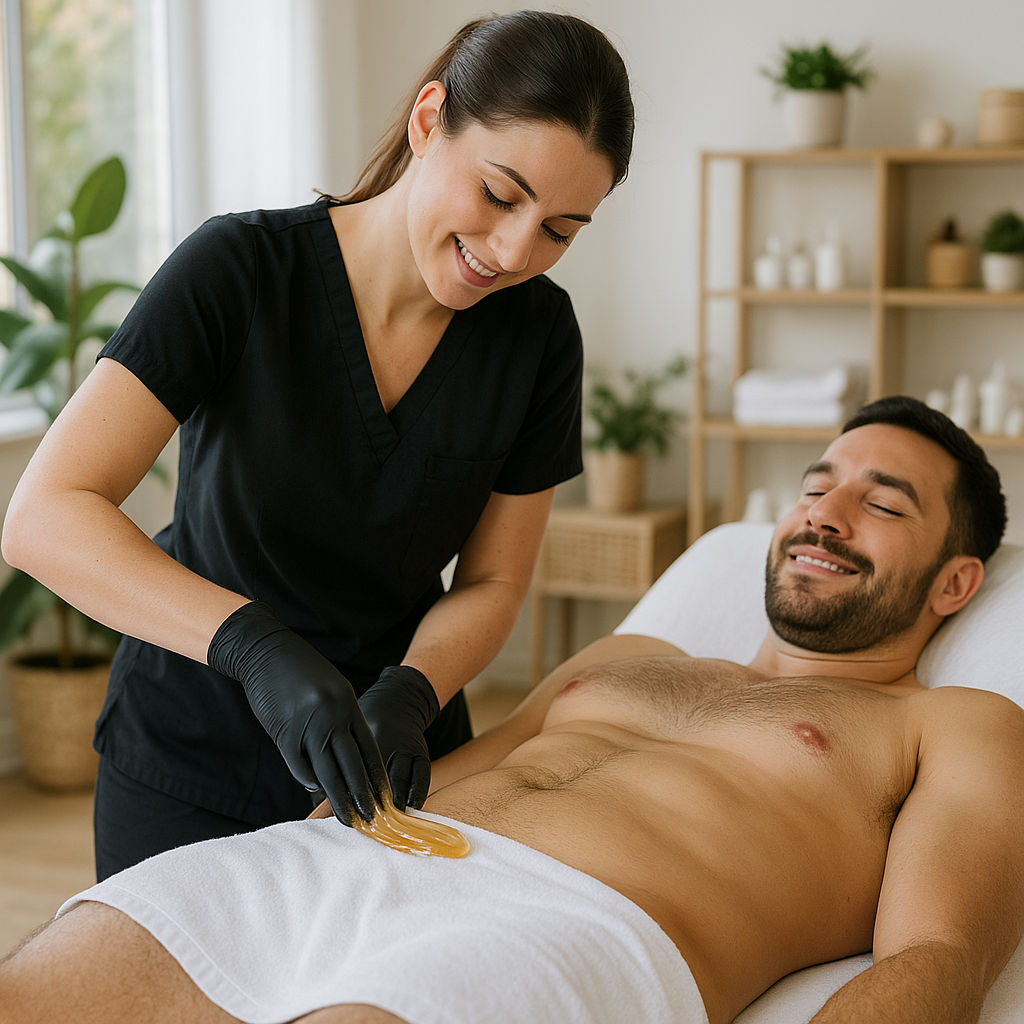 Organic sugaring with bikini facial treatment for men.